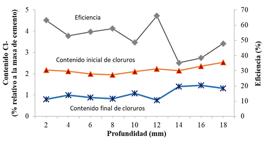 Dos probetas de hormigón reforzado fueron sometidas a la aplicación de la técnica de EEC antes de empezar la primera fase de aplicación de los tratamientos de PC. Una vez acabado el proceso de EEC con los parámetros establecidos, se obtuvieron los perfiles de contenido de Cl-, correspondientes a los estados antes y después del tratamiento de EEC. Los testigos extraídos estaban situados en la zona central de la superficie de la probeta. Por el diseño de la misma y situación del ánodo y el cátodo, el campo eléctrico aplicado es homogéneo en toda la superficie. Las eficiencias locales, entendidas como porcentajes de Cl- extraídos, están representadas en la Figura 2. La media de Cl- extraídos fue del 51% del contenido inicial, es decir el contenido residual de Cl- en el hormigón después de la EEC fue aproximadamente del 1% referido a la masa de cemento. Esto indica un buen comportamiento del proceso de EEC aplicado a un hormigón de cemento portland utilizando como ánodo una capa de pasta de cemento conductora mediante adición de grafito PCC, para una relativamente baja densidad de carga aplicada, 1,5x106 C/m2 relativo a la superficie del hormigón. Este resultado puede ser comparado con el 41% de eficiencia obtenido para un elemento muy similar de hormigón reforzado, con el mismo contenido inicial de Cl-, sometido a un tratamiento de EEC, usando como ánodo una malla de Ti-RuO2, y pasando una densidad de carga total de 1x106 C/m2 (Pérez, et al, 2010).