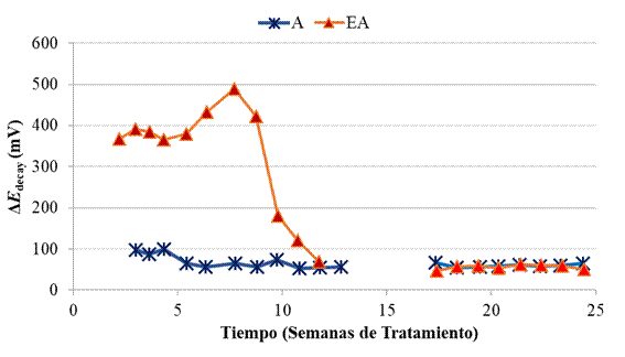 | Figura 4. Evolución del ΔEdecay para la probeta EA (EEC+PC) durante la fase 2 . Primera etapa de 4 semanas donde se aplicaron 20 mA/cm2, y segunda etapa donde se aplicaron 40 mA/cm2. | ||||