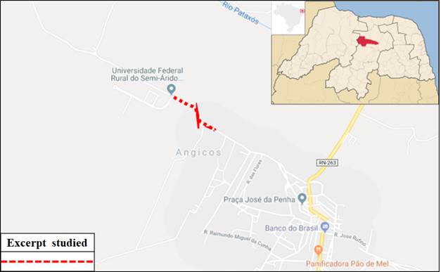 It was used as a sample unit of the present research, a stretch of single way asphalt track with approximately 0.5 km in length that gives access to the campus of the Federal Rural University of the Semi-Arid / UFERSA, in the municipality of Angicos, state of Rio Grande do Norte - Brazil (Figure 1). This stretch, although small in length, proved to be ideal for carrying out the study due to the large number of pathological manifestations on the pavement.