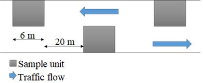 To survey existing pathologies in the study area, sample plots were established every 20 m (in alternating flow-hands), each 6 m long, as established by DNIT Standard 006/2003 - PRO (Figure 2). Altogether 20 stations were considered, which had their defects noted, taking into account the section of the terrain and the types of pathological manifestation, distinguishing between cracks, plastic or consolidated corrugation, shoving, potholes, exudation, wear, patches and wheel tracks streaking. Photographic records of all types of defects found in the section under study were also made.