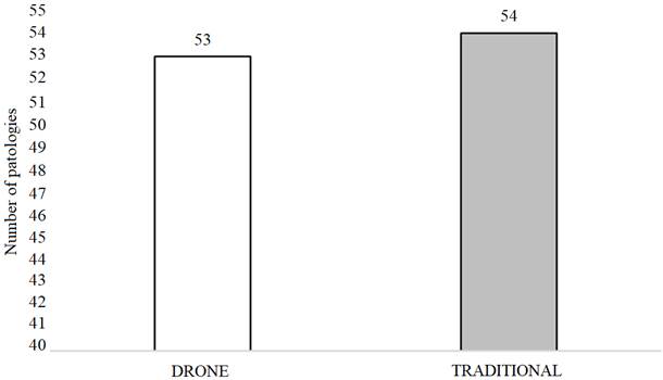 The analyzed section presented a large number of pathologies in both methods employed. The total quantification of pathologies, within the 20 plots evaluated, showed very close values for both methods, being 54 for traditional inspection and 53 for inspection with the Drone, which demonstrates the viability of using the Drone to quantify pathologies on pavements (Figure 5).