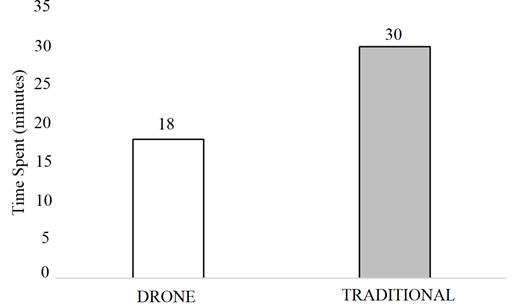 Regarding the time spent for inspection, it was found that the analysis performed with the Drone (6 minutes of flight and 12 minutes for image evaluation) took less than 1/3 of the time spent to perform the traditional inspection (Figure 8 ). Considering that in the present study a small stretch of 0.5 km was evaluated, it is assumed that on longer stretches of large highways this difference is even greater, making the use of the Drone increasingly attractive