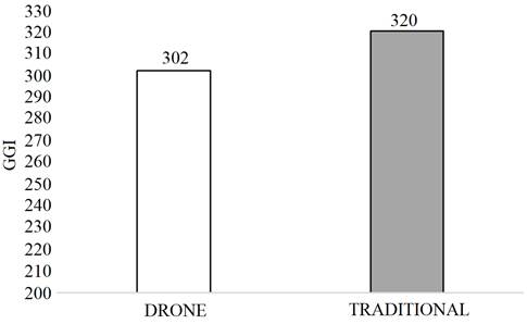 The value obtained for the Global Gravity Index - GGI, was 302 for the realization performed with the Drone and 320 for the traditional method (Figure 9), and in both cases, according to DNIT Standard 006/2003 - PRO , the evaluated stretch was considered to be terrible (GGI> 160). One of the points that influences this result is the presence of a large number of Potholes (P), which was found in all the studied plots, which is the pathology that most impacts traffic and contributes to accelerating the degradation of the pavement. Although there are different values, it is observed that the existing difference is not as long as, demonstrating that navigation with the aid of Drones is technically feasible.