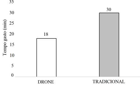 No que diz respeito ao tempo gasto para inspeção, constatou-se que a análise realizada com o Drone (6 minutos de voo e 12 minutos para avaliação das imagens) levou menos de 1/3 do tempo gasto para realização da inspeção tradicional (Figura 8). Considerando que no presente estudo avaliou-se um pequeno trecho de 0,5 km, é de se supor que em trechos mais extensos de grandes rodovias esta diferença seja ainda maior, tornando o emprego do Drone cada vez mais atrativo.