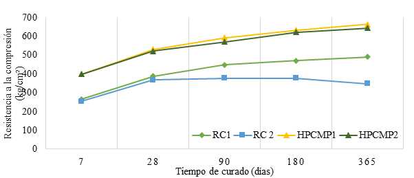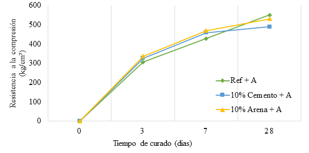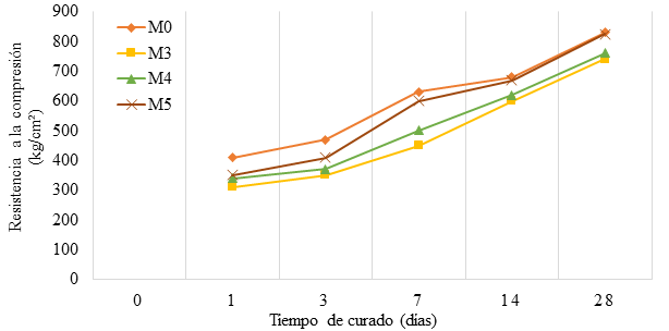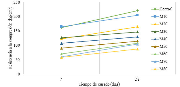 El-Sayed, Farag, Kandeel, Younes, y Yousef (2016) sustituyeron el 3, 4 y 5 % del peso del cemento con polvo de mármol, observando que, por la alta presencia de carbonato de calcio, no afectó las propiedades del cemento. Con las pastas de cemento endurecido se realizaron pruebas a compresión a edades de 1, 3, 7, 14 y 28 días, se observó que las resistencias aumentaron proporcionalmente a la edad de curado de 1 a 28 días, como se muestra en la Figura 1
