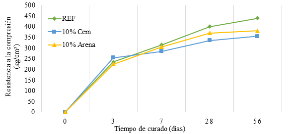 En estos trabajos se demuestra que la resistencia a la compresión de los especímenes no se ve afectada cuando se sustituye como máximo el 5% de polvo de mármol por cemento. Se observa en las gráficas de resultado de ensayes que el incremento de resistencia es similar en los especímenes que tienen polvo de mármol y los que no lo tienen.