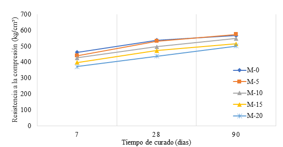 A los 90 días de curado la mezcla con un reemplazo del 5% de polvo de mármol al cemento incrementó la resistencia a la compresión, inclusive mayor que la mezcla sin polvo de mármol (Figura 5).