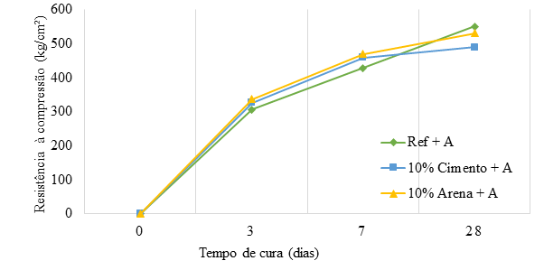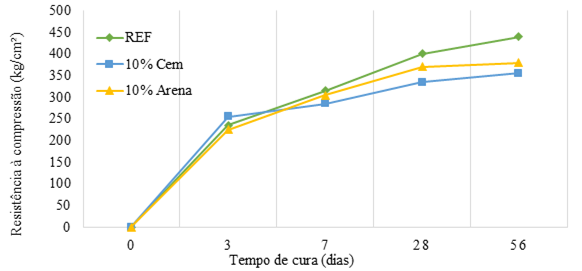Os resultados obtidos são apresentados na Figura 2, observa-se que a mistura com substituição de 10% de cimento por pó de mármore apresentou redução na resistência à compressão. No entanto, o pó de mármore utilizado em substituição a 10% de areia, obteve maior resistência do que a mistura com substituição do pó de mármore por cimento.