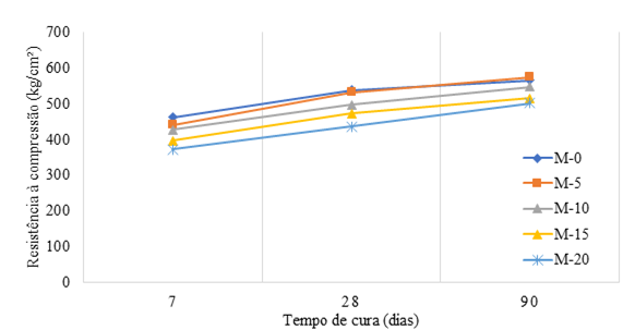 Foi demonstrado que o corpo de prova com 5% (M5) de pó de mármore, após 28 dias de cura, obteve a mesma resistência à compressão que a amostra controle de cimento Portland comum sem adições.