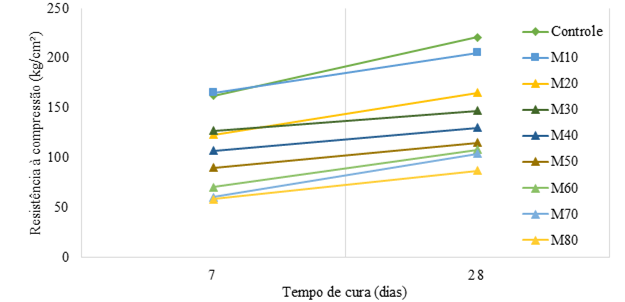 A partir dos ensaios de resistência à compressão aplicados às dosagens anteriores aos 7 e 28 dias de cura, obtiveram-se os seguintes resultados, que são mostrados na Figura 6.