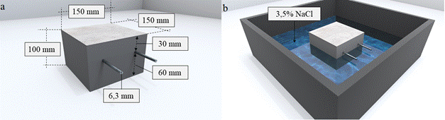 Finalmente, luego del proceso de curado de 91 días, los cuerpos de prueba se colocaron en un horno a 50 °C durante 5 días para su secado. Enseguida, las superficies laterales de los prismas fueron aisladas de la exposición a cloruros con una pintura epoxi, con la intención que el frente de contaminación avanzara solamente por la fase con recubrimiento de 60 mm. Para inducir la corrosión del acero embebido en el hormigón, se utilizó un proceso de envejecimiento acelerado que involucró la absorción y difusión de iones de cloruro en la matriz del cemento. El envejecimiento acelerado siguió un sistema de inmersión parcial alternado en ciclos. Los ciclos consistieron en el secado en estufa a 50 °C durante 5 días y la inmersión parcial de los prismas en agua con 3,5% de NaCl en masa durante 2 días, como muestra la Figura 1 (b). Este enfoque se adoptó con base en otros trabajos que utilizaron el mismo sistema de inmersión alternado (Freire, 2005; Dotto, 2006; Silva, 2010; Rocha, 2012; Silva, 2017).
