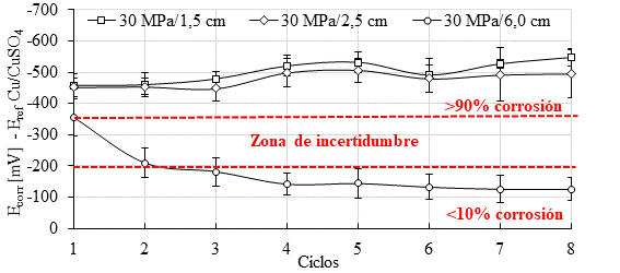En cada ánodo se efectuó una lectura, totalizando 6 lecturas por cuerpo de prueba: cuatro en los ánodos del sensor y dos en las barras de refuerzo. En las lecturas se utilizó un electrodo de referencia de Cu/CuSO4. Para analizar los resultados con el fin de estimar la probabilidad de corrosión, se consideraron los límites encontrados en la ASTM C876-15.