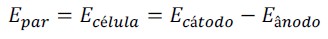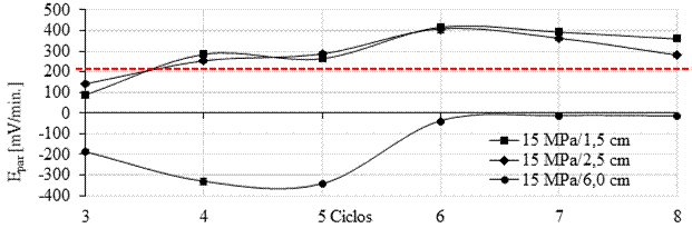 Como no se aplica corriente externa a la macro-célula galvánica, el potencial de polarización de los electrodos (ánodo y cátodo) siempre está en el rango del potencial natural de los metales dentro del hormigón (Mccarter y Vennesland, 2004). Por lo tanto, el valor de Epar fluctuará en función de las condiciones del ambiente (Pawlick et al., 1998). Siendo así, el valor de Epar debe obtenerse empíricamente (Sousa, 2014), y su valor incluye los valores de Eeq y η, prescindiendo de la determinación de estos factores por separado.