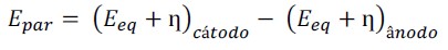 En la práctica, Ecátodo es el potencial de polarización del cátodo, y Eánodo es el potencial de polarización del ánodo. El potencial de polarización es el resultado del desplazamiento (η) del potencial de equilibrio irreversible del metal (Eeq) por la formación del par galvánico. Por tanto, la ecuación 1 se puede escribir como muestra la Ecuación (2).