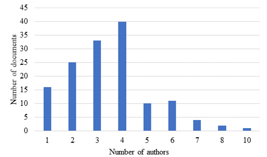 | Figure 7. Distribution of documents by number of authors per article (data from Scielo Analytics). | ||||