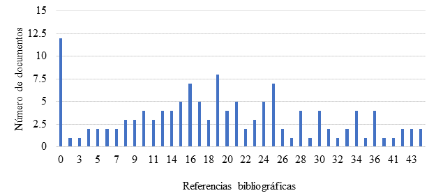 | Figura 8. Distribución de documentos por número de referencias bibliográficas por artículo (Scielo Analytics) | ||||