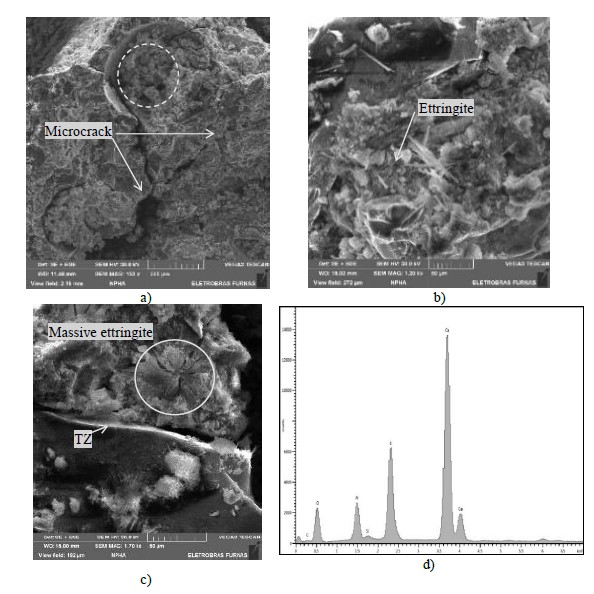 Analyses performed at one year by SEM and EDS had evidenced the presence of delayed ettringite in some conditions. It is possible to compare differences from each cement used and also the magnitude of neoformations. Expansions, as well as mechanical behavior, can be explained by microstructure. DEF damages for tensile strength followed this descending order: CP V; CP II-F; CP II-Z; CP IV. From a microstructural point of view, ettringite neoformation incidences in the voids and cement paste and fragility of paste were observed in the same order. However, some loss of adherence between paste and aggregate was detected in all the samples, independent of the cement type. Furthermore, for mortars cast without fly-ash pozzolan (CP V e CP II-F), the presence of ettringite neoformations was more significant. Compressive strength behavior was similar to tensile strength, even though cement CP II-Z did not promote an abrupt decrease when compared to cement CP IV at one year. In relation to DEF expansion levels, major values were achieved for cement with no admixture (CP V), followed by the CP II-F cement. In addition, major damages for cement pastes and TZ were demonstrated by SEM in the presence of DEF.