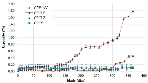 De acordo com a Figura 2, as expansões para as argamassas contendo cimento CP V foram muito maiores do que aquelas na presença de adiões minerais. O primeiro grande aumento iniciou após 150 dias e durou até 200 dias; após isso, observou-se um período de dormência por até 260 dias, seguido de outro aumento da expansão até cerca de 300 dias. Em seguida, a taxa de expansão crescente se intensificou até 365 dias (a expansão máxima foi de 1.8%). Embora os cimentos com cinza volante (ambos, CP II-Z e CP IV) tenham produzido expansões reduzidas (abaixo de 0.10% em 365 dias), uma maior dispersão para expansões foi observada ao longo do tempo. O cimento com filer calcário (tipo CP II-F) teve um desempenho totalmente diferente dos demais. Com o tempo e até cerca de 300 dias houve pequenas expansões abaixo de 0.06%. Após este período, percebeu-se uma taxa de crescimento significativa para até 365 dias, quando a argamassa atingiu uma expansão média de 0.45%.