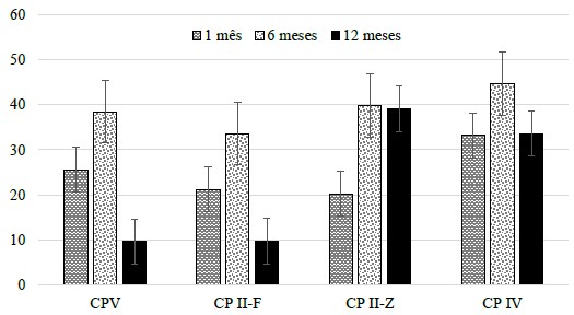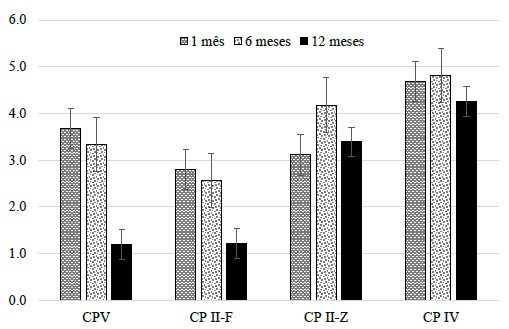 As argamassas com cinza volante resultaram desempenho diferente, com aumento da resistência à tração até os primeiros seis meses, seguindo o comportamento da resistência à compressão, mas com o passar do tempo, e aos 12 meses, houve uma queda de 19% e 12% para o CP II -Z e CP IV, respectivamente (Figura 4). O ganho inicial na resistência à tração ocorre devido às reações pozolânicas envolvendo as adições minerais que estão presentes nestes cimentos.
