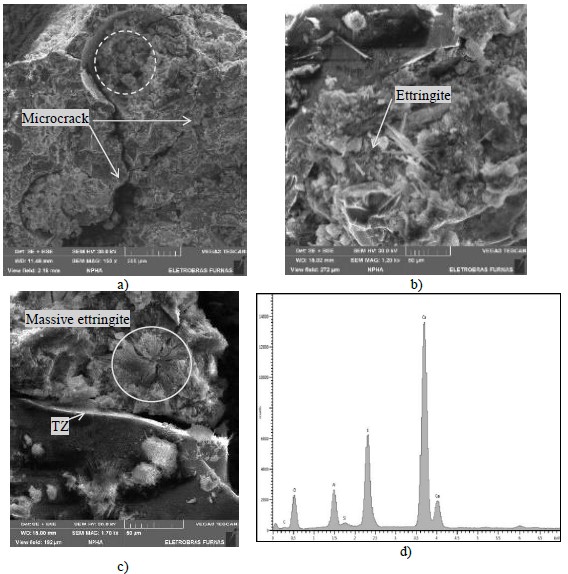 Análises realizadas em um ano por MEV e EDS evidenciaram a presença de etringita tardia em algumas condições. É possível comparar as diferenças de cada cimento utilizado e também a magnitude das neoformações. As expansões, assim como o comportamento mecânico, podem ser explicadas pela microestrutura. Os danos de DEF para resistência à tração seguiram esta ordem decrescente: CP V; CP II-F; CP II-Z; CP IV. Do ponto de vista microestrutural, foram observadas incidências de neoformação de etringita nos vazios e pasta de cimento e fragilidade da pasta na mesma ordem. Porém, alguma perda de aderência entre pasta e agregado foi detectada em todas as amostras, independente do tipo de cimento. Além disso, para as argamassas produzidas sem cinza volante (CP V e CP II-F) a presença de neoformações de etringita foi mais significativa. O comportamento da resistência à compressão foi semelhante à resistência à tração, embora o cimento CP II-Z não tenha promovido uma queda abrupta quando comparado ao cimento CP IV em um ano. Em relação aos níveis de expansão de DEF, os maiores valores foram alcançados para o cimento sem adição (CP V), seguido do cimento CP II-F. Além disso, os principais danos para pastas de cimento e zona de transição foram demonstrados por MEV na presença de DEF.