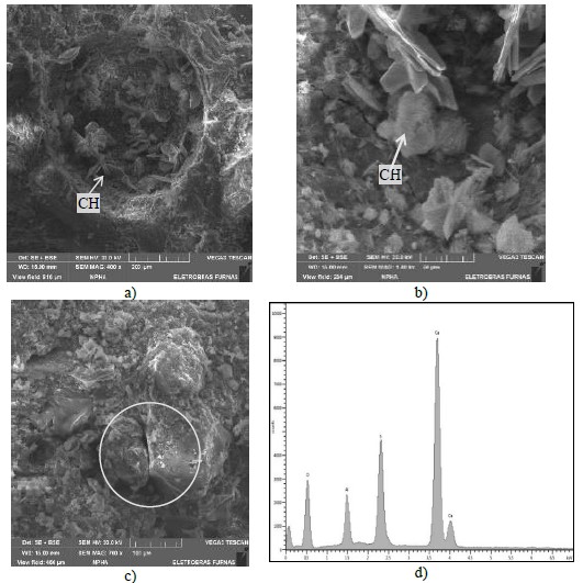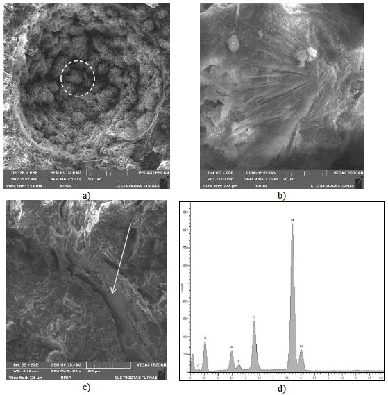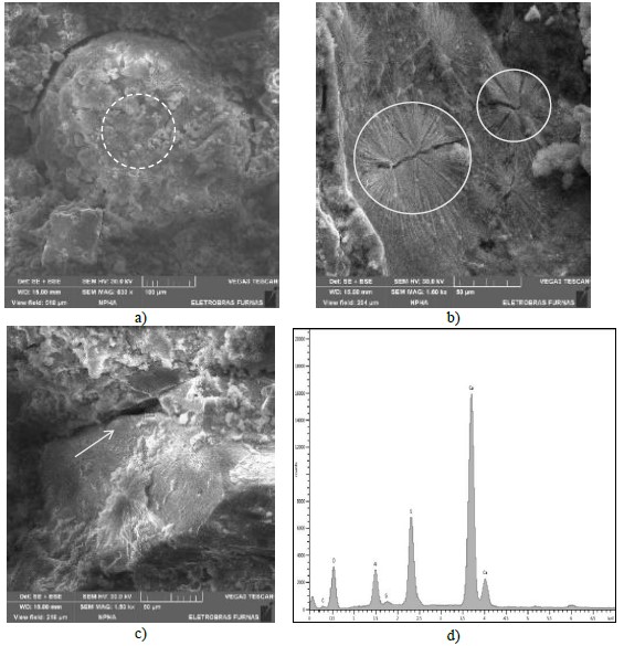 Correlações entre as resistências e o nível de expansões são apresentadas na Figura 5 e na Figura 6. Conforme as expansões aumentam, as resistências diminuem para os cimentos CP V e CP II-F; por outro lado, não é possível estabelecer correlação na presença de cimentos com a cinza volante (CP II-Z e CP IV). Para corroborar essa afirmação, análises microestruturais foram realizadas e indicam claramente a formação de cristais de etringita nas argamassas contendo cinza volante. Amostras de argamassa de outros cimentos também foram analisadas e a DEF detectada. Nas Figuras de 7 a 10 a ocorrência de DEF pode ser observada, e alguns espectros de EDS são apresentados, confirmando a característica química das formações de etringita.