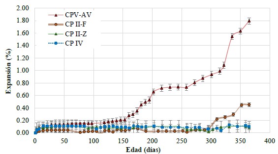 De acuerdo con la Figura 2, las expansiones para las argamasas conteniendo cemento CP V fueron mucho mayores que aquellas en la presencia de adiciones minerales. El primer gran aumento se inició después de 150 días y duró hasta 200 días; pasado ese tiempo, se observó un periodo de letargo de hasta 260 días, seguido de otro aumento de la expansión por cerca de 300 días. Rápidamente, la tasa de expansión creciente se intensificó hasta 365 días (la expansión máxima fue del 1.8%). Aunque los cementos con ceniza volante (ambos, CP II-Z y CP IV) hayan producido expansiones reducidas (por debajo del 0.10% en 365 días), se observa una mayor dispersión para expansiones a lo largo del tiempo. El hormigón con filler calcáreo (tipo CP II-F) tuvo un desempeño totalmente diferente de los demás. Con el tiempo y hasta cerca de 300 días hubo pequeñas expansiones por debajo del 0.06%. Tras este periodo, se percibió una tasa de crecimiento significativa de hasta 365 días, cuando la argamasa alcanzó una expansión media del 0.45%.