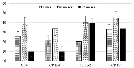 Las argamasas con ceniza volante obtuvieron un desempeño diferente, con aumento de la resistencia a la tracción hasta los primeros seis meses, siguiendo el comportamiento de la resistencia a la compresión, pero con el pasar del tiempo, y a los 12 meses, hubo una disminución del 19% y del 12% para el CP II -Z y CP IV, respectivamente (Figura 4). La ganancia inicial en la resistencia a la tracción se da debido a las reacciones puzolánicas involucrando las adiciones minerales que están presentes en estos hormigones.