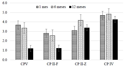 Las propiedades mecánicas fueron coherentes con el comportamiento de las expansiones entre los cementos testados. La resistencia a la compresión de los morteros aumentó de un mes para seis meses para todos los hormigones testados (Figura 3). Por otro lado, a los 12 meses hubo una disminución. Dicha reducción de esta propiedad en comparación a los 28 días fue mucho más crítica para el cemento sin adición (CP V) y aquel con filler de calcáreo (CP II-F), el 63% y el 54%, para niveles de expansión de 1.79 y 0.45, respectivamente. Aunque el nivel de expansiones del CP V haya sido superior al del CP II-F, la argamasa obtuvo mayores resistencias en las primeras edades con relación al hormigón CP II-F. Expansiones por encima del 0.40% son muy elevadas, impactando en las resistencias y fisurando los compositos, como era esperado (Schovanz, 2019; Bronholo, 2020).