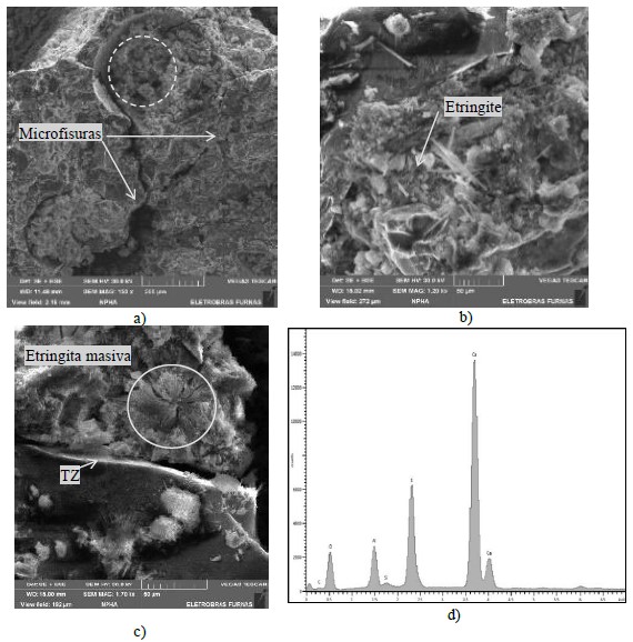 Los análisis realizados en un año por MEV y EDS comprobaron la presencia de Etringita tardía en algunas condiciones. Es posible comparar las diferencias de cada cemento utilizado y también la magnitud de las neoformaciones. Las expansiones, así como el comportamiento mecánico, pueden ser explicados por la microestructura. Los daños de DEF para la resistencia a la tracción siguieron este orden decreciente: CP V; CP II-F; CP II-Z; CP IV. Del punto de vista microestructural, se observaron incidencias de neoformación de Etringita en los vacíos y pasta de hormigón y fragilidad de la pasta en el mismo orden. Aunque, se detectó alguna pérdida de adherencia entre la pasta y el agregado en todas las muestras, independientemente del tipo de cemento. Además de eso, para las argamasas producidas sin ceniza volante (CP V e CP II-F) la presencia de neoformaciones de Etringita fue más significativa. El comportamiento de la resistencia a la compresión fue semejante a la resistencia a la tracción, aunque el cemento CP II-Z no haya promovido una disminución abrupta cuando se compara al cemento CP IV en un año. Con relación a los niveles de expansión de DEF, los mayores valores se alcanzaron para el cemento sin adición (CP V), seguido del cemento CP II-F. Además de eso, los principales daños para las pastas de hormigón y la zona de transición se demostraron por MEV en la presencia de DEF.