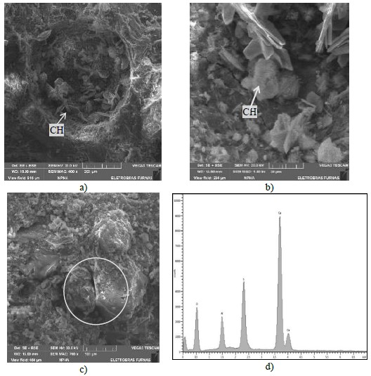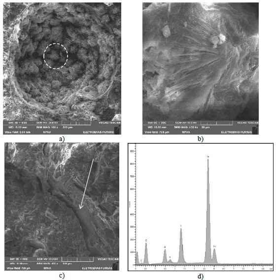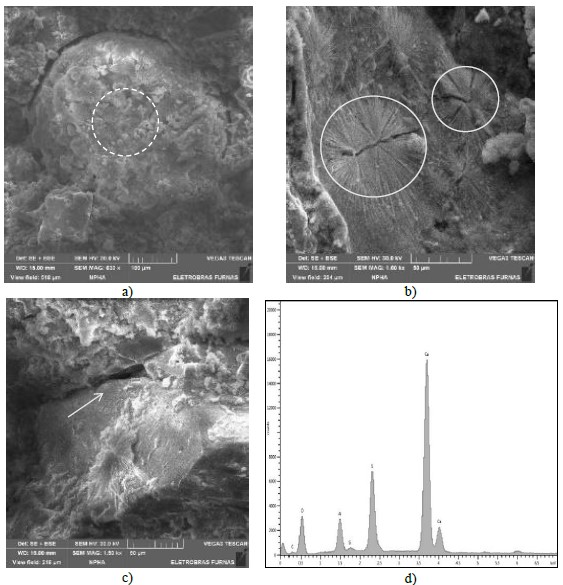 Las correlaciones entre las resistencias y el nivel de expansiones se presentan en la Figura 5 y en la Figura 6. Conforme las expansiones aumentan, las resistencias disminuyen para los cementos CP V y CP II-F; por otro lado, no es posible establecer correlación en la presencia de cementos con la ceniza volante (CP II-Z y CP IV). Para corroborar esa afirmación, se realizaron análisis microestructurales y se indicaron claramente la formación de cristales de Etringita en las argamasas conteniendo ceniza volante. De la misma manera, se analizaron muestras de argamasa de otros hormigones y la DEF detectada. En las imágenes 7, 8, 9 y 10 se puede observar la presencia de DEF, y se presentan algunos espectros de EDS, confirmando la característica química de las formaciones de Etringita.