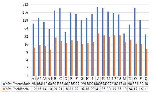 Os referidos métodos foram utilizados por Segat (2005) no qual baseiam-se em duas formas distintas de quantificação dos casos patológicos observados. No método da incidência, cada MP é contabilizada uma única vez por fachada, mesmo que esta ocorra repetidas vezes, enquanto que no método da intensidade toda MP é contabilizada, independentemente da quantidade de repetição.