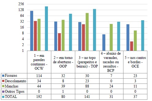 As MPs também foram quantificadas em cada região tipificada da fachada, qual seja, dada por sua localização. Para atribuição da localização das MPs a fachada foi dividida em cinco áreas, quais são: (1) em paredes contínuas-OCW, (2) ao entorno de aberturas-OOP, (3) no topo de parapeitos e beirais-TOP, (4) abaixo de varandas, sacadas ou ressaltos-BCP e (5) nos cantos e bordas-OCE, conforme Figura 2.
