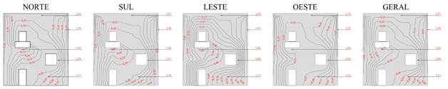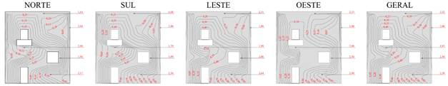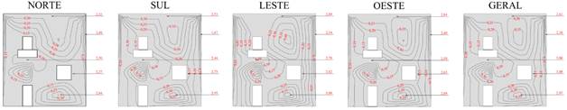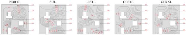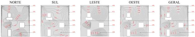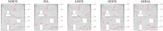 O Potencial de Degradação (DP) em cada região tipificada da edificação é apresentada nas Figuras 8 e 9, para cada orientação solar específica e geral, para os Métodos da Intensidade e Incidência.