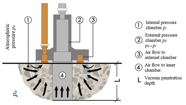 The air permeability coefficient (kT) in concretes with a GS of 65% is obtained with the Proceq Torrent Permeability Tester equipment. This equipment consists of a cell with a double vacuum chamber and a pressure regulator that ensures that the air flows at the correct angle from the surface to its internal chamber (see Figure 2). This allows the calculation of kT through a rapid and non-destructive test that can be carried out both in the laboratory and on site. Measurements are made on 3 specimens on both sides for each dosage studied.