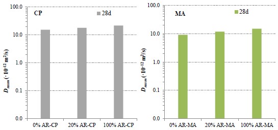 The plot shows that there is an increase in the migration coefficient when the amount of AR in the mixtures increases, regardless of the type of cementitious matrix used, due to the higher porosity of the AR, coinciding with what was found by Kou and Poon (Kou and Poon, 2010) and Kou et al. (Kou et al., 2011). The migration coefficient is lower in all concrete with MA, so it can be stated that the presence of CV and FCC in the cementitious matrix leads to important improvements in the porous structure, both for concrete with AR and with AN. In cases where there are no substitutions of recycled aggregate (0%), the migration coefficient increases when the matrix is composed only of CP, which means that the alternative matrix combined with natural aggregate (0% AR-MA), behaves even better than the standard (0% AR-CP).