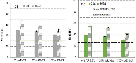 Com relação à caracterização mecânica dos concretos, o valor médio de quatro corpos de prova foi utilizado para a análise da resistência à compressão. A Figura 4 mostra os valores obtidos para resistência à compressão, onde a porcentagem expressa, seguida de AR, refere-se à quantidade de agregado reciclado presente na mistura; CP, refere-se à matriz cimentícia composta por CEM I 52,5 R; e MA à matriz cimentícia alternativa (35% de cinzas volantes, 15% de catalisador de craqueamento catalítico e 50% de CP). De forma geral, observa-se que todos os concretos ultrapassam os limites estabelecidos pela EHE-08 para serem utilizados como concreto estrutural (25 MPa) e como concreto em zonas atmosféricas expostas a meio marinho (30 MPa), embora seja notável que o os valores de resistência à compressão são menores em todos os concretos em relação ao padrão (0% AR-CP), tanto aos 28 quanto aos 365 dias. Os resultados mostram que à medida que aumenta a percentagem de substituição do agregado natural por agregado reciclado, ocorre uma diminuição da resistência, coincidindo com os resultados obtidos por outros autores (Hansen, 1992, Poon, 2004, Etxebarria et al., 2007, Corinaldesi, 2010). Isso acontece tanto no concreto com o CP quanto nos feitos com o MA. O uso de agregados reciclados afeta esta propriedade devido à sua maior porosidade e ao fraco comportamento da microestrutura devido à existência de diferentes zonas de interface, pois além da junção pasta-agregado que o agregado reciclado apresenta, surge outra zona de contato a pasta de agregado reciclado e a nova pasta.