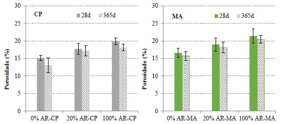 No caso dos concretos com substituições de 20% e 0% do NA por RA, este é inferior aos anteriores e observa-se uma relação aparente entre porosidade e matriz cimentícia, pois, embora diminua, os maiores valores são observados para concretos com matriz alternativa (20% AR-MA e 0% AR-MA). Aos 365 dias, a porosidade diminui nos concretos com apenas um tipo de agregado, natural ou reciclado (substituições de 0% e 100%) e nenhum aumento significativo é observado naqueles com combinação de agregados (20% AR-CP e 20 % AR-MA). Isso se deve ao maior desenvolvimento completo das reações de hidratação, com a consequente diminuição da porosidade capilar. Nessa idade, também se observa que a porosidade aumenta à medida que aumenta a quantidade de agregado reciclado na mistura e que, para o mesmo percentual de substituição, o valor é maior nos concretos feitos com a matriz alternativa, mesmo naqueles com 100% substituições.