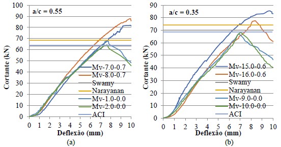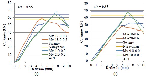 Comportamento de vigas reforçadas com fibra sem estribos em comparação com vigas de controle. (a) Relação a/c = 0,55. (b) Relação a/c = 0,35.