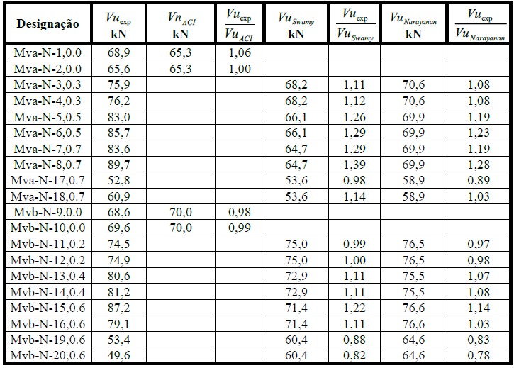 Tabela 8. Resistência experimental ao cisalhamento em vigas de concreto reforçado com fibras, para as duas relações a/c