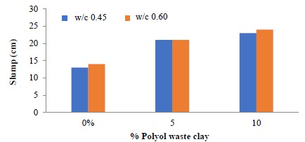 Figure 1 shows that for mixtures with clay addition, an increase in workability proportional to the increase in clay is observed as a partial replacement for cement (13-14cm, 21cm and 23-24cm slump for 0%, 5% and 10%, respectively). However, in none of the evaluated cases (with/without clay), significant differences were observed between the mixtures with w/c ratios of 0.60 and 0.45; which may be due to the excellent quality of the aggregates used.