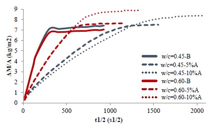 Table 6 shows the results obtained for the main kinetics properties, with the addition of polyol clay the water gain in the concrete (k) decreased; observing an increase in resistance to water penetration m (s/m2). This behavior was evidenced for both w/c ratios (0.45 and 0.60).