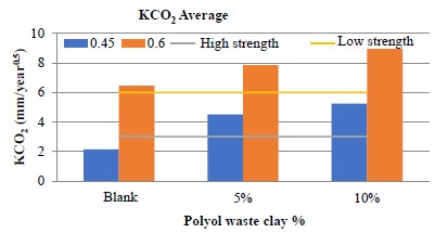 Figure 5 shows the effect of clay on the natural carbonation rate. It can be seen that the increase in the polyol clay concentration is accompanied by an increase in the carbonation front for the two w/c ratios; which matches the results of effective porosity.