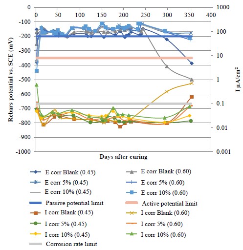 Figure 6 shows the average corrosion potentials and rates as a function of time, after 350 days of exposure to this accelerated test. Note the beneficial effect of polyol clay on the corrosion rate, where the bars for both w/c ratios were active for the blanks in the time where the specimens with partial substitution of cement for polyol clay were passive. Moreover, when the bars in the specimen with w/c 0.45 were activated, those located in the specimen with w/c 0.60 and polyol waste clay had not yet been activated. This effect was expected, given the greater resistance to water penetration in the clay specimens.