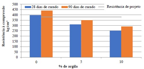 Após um período de cura de 28 e 90 dias, em condições de alta umidade relativa (corpos de prova embrulhados em jornal e saturados com água) e temperatura ambiente (≤ 25 ° C), o ensaio foi realizado de acordo com a norma ASTM C39 / C39M- 2012