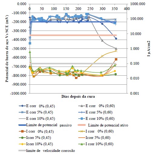 O potencial de corrosão foi determinado duas vezes por semana na armadura dos corpos de prova prismáticos, utilizando um eletrodo de referência Cu/CuSO4 saturado e um multímetro. Cada corpo de prova prismático possui duas barras de aço carbono embutidas no concreto, identificadas como A e B, localizadas a 1,5 cm da face exposta.