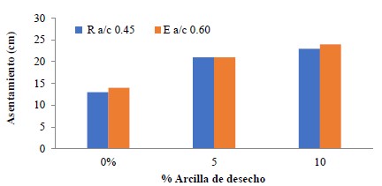 Para las mezclas 0,45 y 0,60 con 5% de sustitución se registró un revenimiento de 21 cm para ambas mezclas frescas, con un aumento aproximado de 8 cm con respecto a los valores registrados para las mezclas de referencias (blancos). Para las mezclas 0,45 y 0,60 con 10% de sustitución se registraron 23 y 24 cm de asentamiento, respectivamente, con un aumento de 10 cm en comparación con sus mezclas de referencia. Estos resultados evidencian un efecto sobre la trabajabilidad de la mezcla fresca por la adición de la arcilla como sustituto parcial del cemento siendo más notorio el efecto respecto al blanco para las menores dosificaciones de la arcilla, ya que la diferencia de la trabajabilidad de la mezcla entre 5 y 10% de sustitución es mínima (aproximadamente 2 cm de asentamiento).