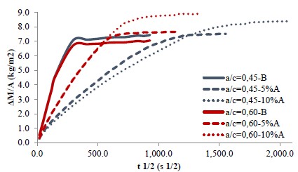 En la Figura 4 se observa que los blancos en ambas R a/c son muy similares, sin embargo, las pendientes cambian drásticamente para R a/c de 0,45 al sustituir arcilla; notándose una marcada diferencia entre las mezclas, con sustitución parcial de la arcilla de desecho, con R a/c 0,45 y 0,60 en lo que respecta a la ganancia de agua k; donde este valor está representado por la pendiente de la región lineal de la curva. Con estos resultados es evidente que el uso de arcilla ofrece mayor resistencia a la penetración del agua. Esta propiedad infiere una mayor resistencia a la penetración de iones agresivos como el ion cloruro (Cl-). No obstante, la porosidad efectiva (ξ,), se incrementó ligeramente con el contenido de arcilla, independiente de la relación a/c; por lo cual pareciera que el poliol ejerce un efecto hidrofugante a la mezcla.