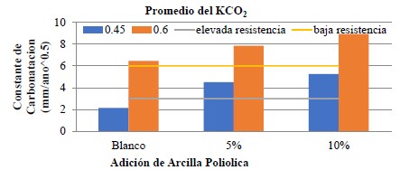 La Figura 5 muestra el efecto de la arcilla sobre la velocidad de carbonatación. Se puede observar que el aumento de la concentración de arcilla viene acompañado con un aumento del frente de carbonatación para las dos R a/c; lo cual coincide con los resultados de porosidad efectiva.