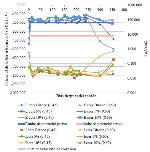 La Figura 6 muestra los potenciales y las velocidades de corrosión promedio en función del tiempo, luego de 350 días de exposición a este ensayo acelerado. Obsérvese el efecto benéfico de la arcilla sobre la velocidad de corrosión, donde las barras en los blancos para ambas R a/c se mostraron activas para el tiempo donde las probetas con sustitución parcial de cemento por arcilla se muestran pasivas. Inclusive, se activaron las barras en las probetas con R a/c 0,45 y todavía no se habían activado las localizadas en las probetas con R a/c 0,60 y arcilla de desecho. Este efecto se esperaba, dada la mayor resistencia a la penetración de agua en las probetas con arcilla.