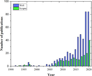 During the period between years 1990-2020, considered in this work, since the publication of the first article according to the Scopus database in 1990, the number of articles published per year was less than 10 until 2007.